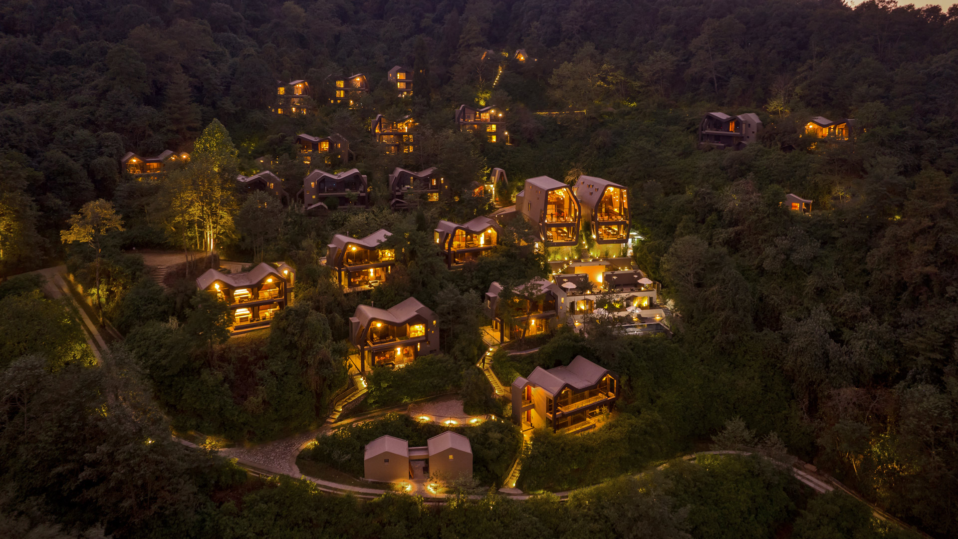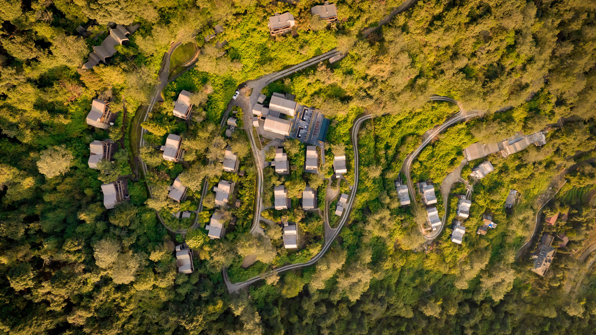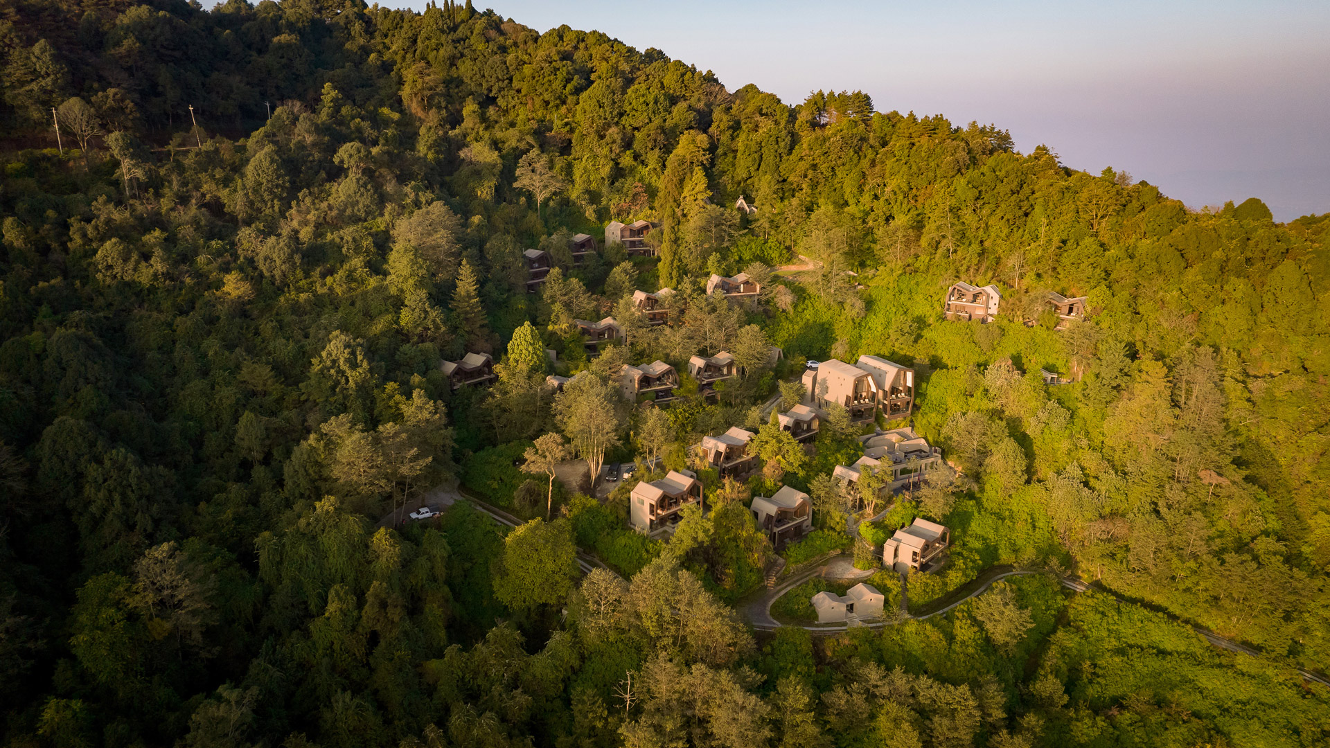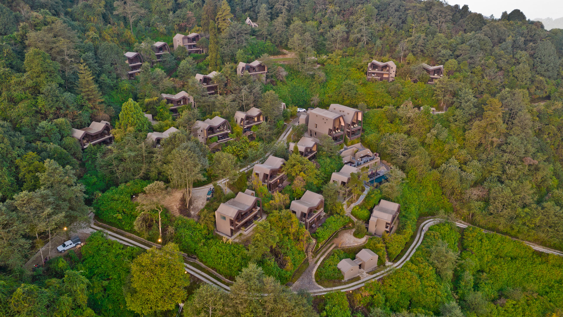 Located on one of the highest hills of the Valley, the site commands a magnificent view of the Himalayan range. As a part of a bigger hospitality development, the Leaf includes 20 branded villas that will be managed by an international operator. Concealed within a dense forest, the arrangements of buildings are placed strategically to reduce environmental impacts while maximizing the views, privacy and sunlight. The main drive meanders through the site, providing access to individual buildings and finally culminating at the clubhouse located at the highest point. The central landscape area in the middle channels the rain water towards the stormwater pond (at the bottom of the bigger site) and then subsequently filtered for re-use.