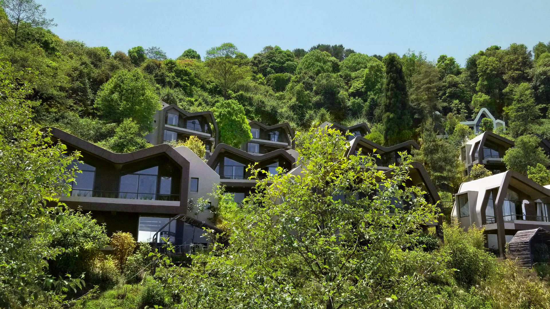 Located on one of the highest hills of the Valley, the site commands a magnificent view of the Himalayan range. As a part of a bigger hospitality development, the Leaf includes 20 branded villas that will be managed by an international operator. Concealed within a dense forest, the arrangements of buildings are placed strategically to reduce environmental impacts while maximizing the views, privacy and sunlight. The main drive meanders through the site, providing access to individual buildings and finally culminating at the clubhouse located at the highest point. The central landscape area in the middle channels the rain water towards the stormwater pond (at the bottom of the bigger site) and then subsequently filtered for re-use.
