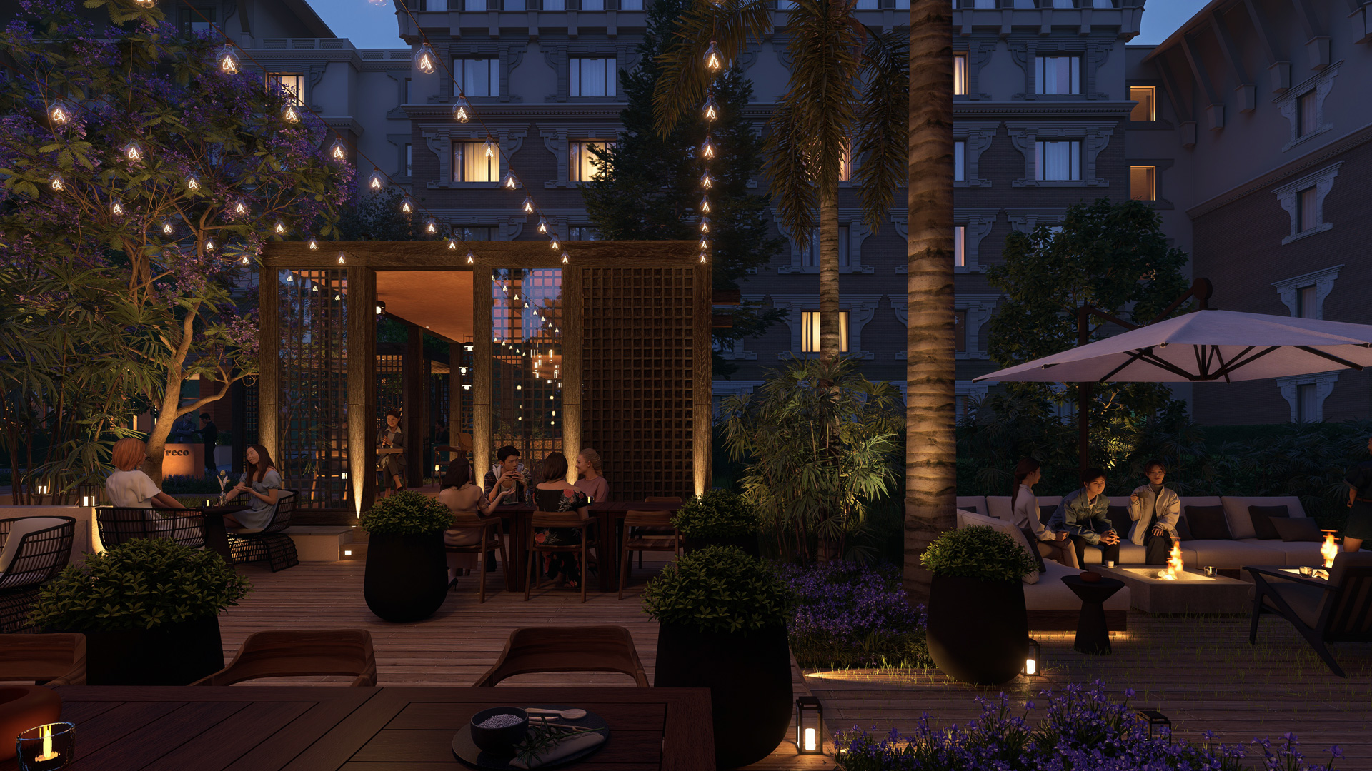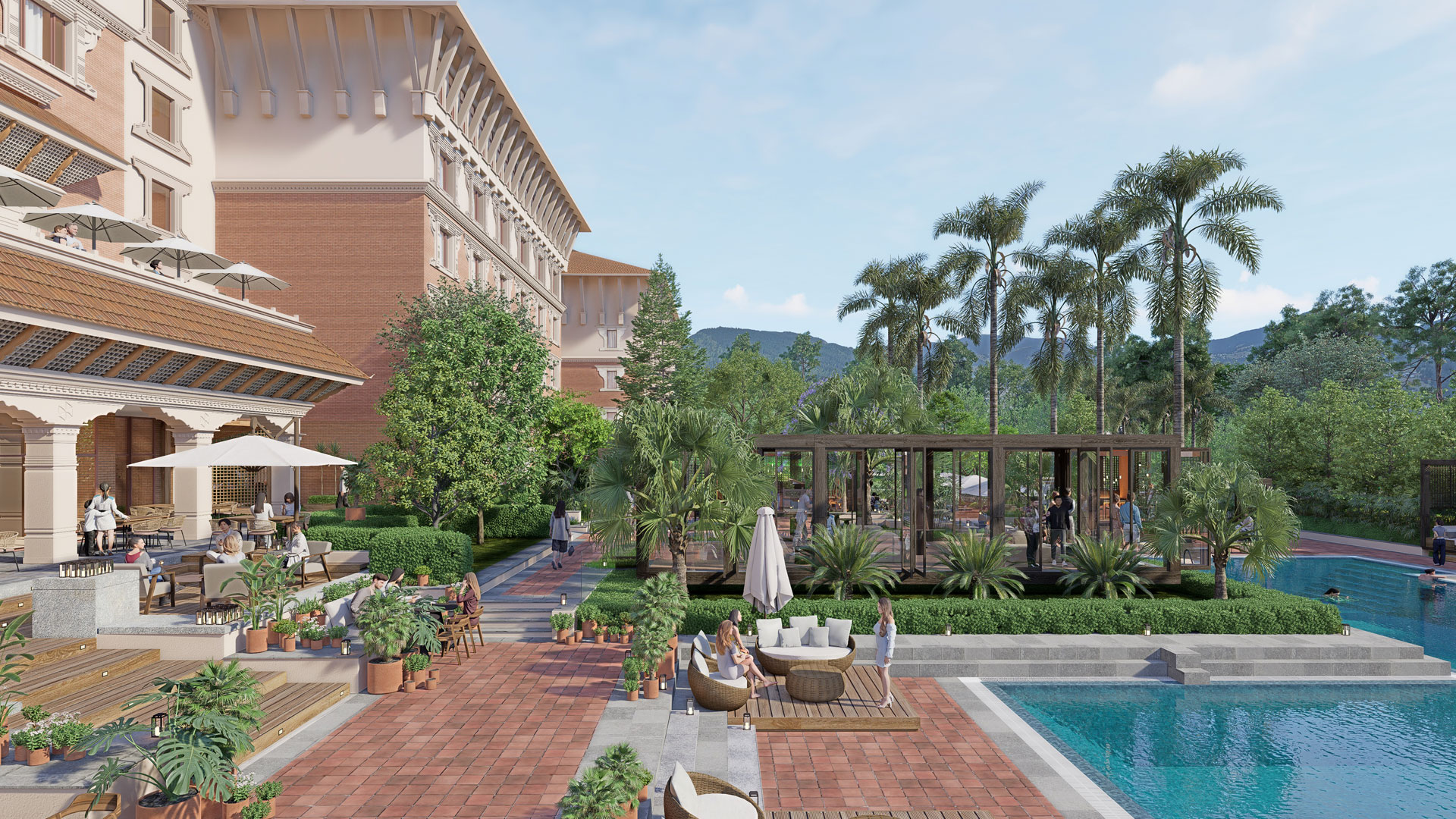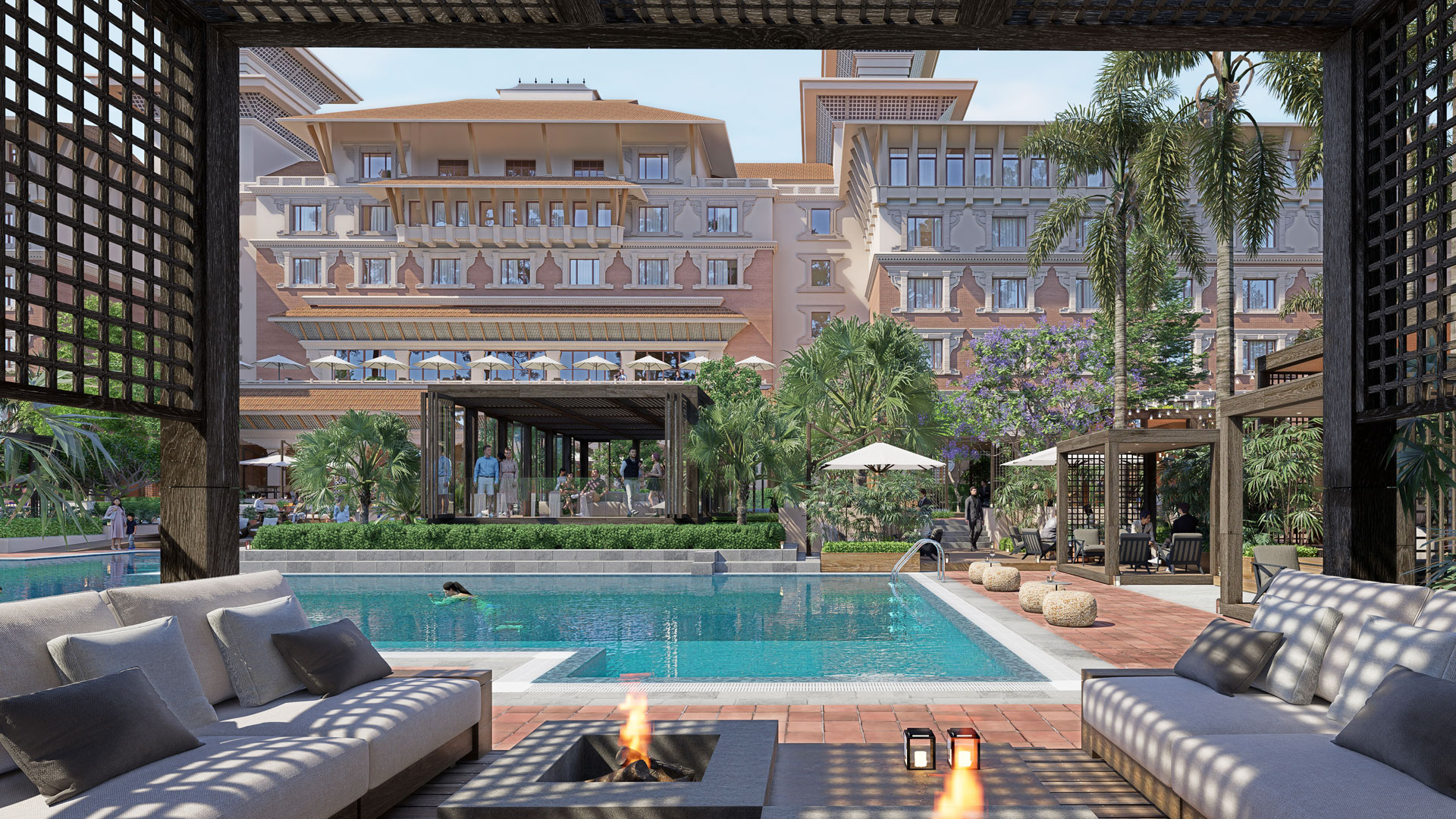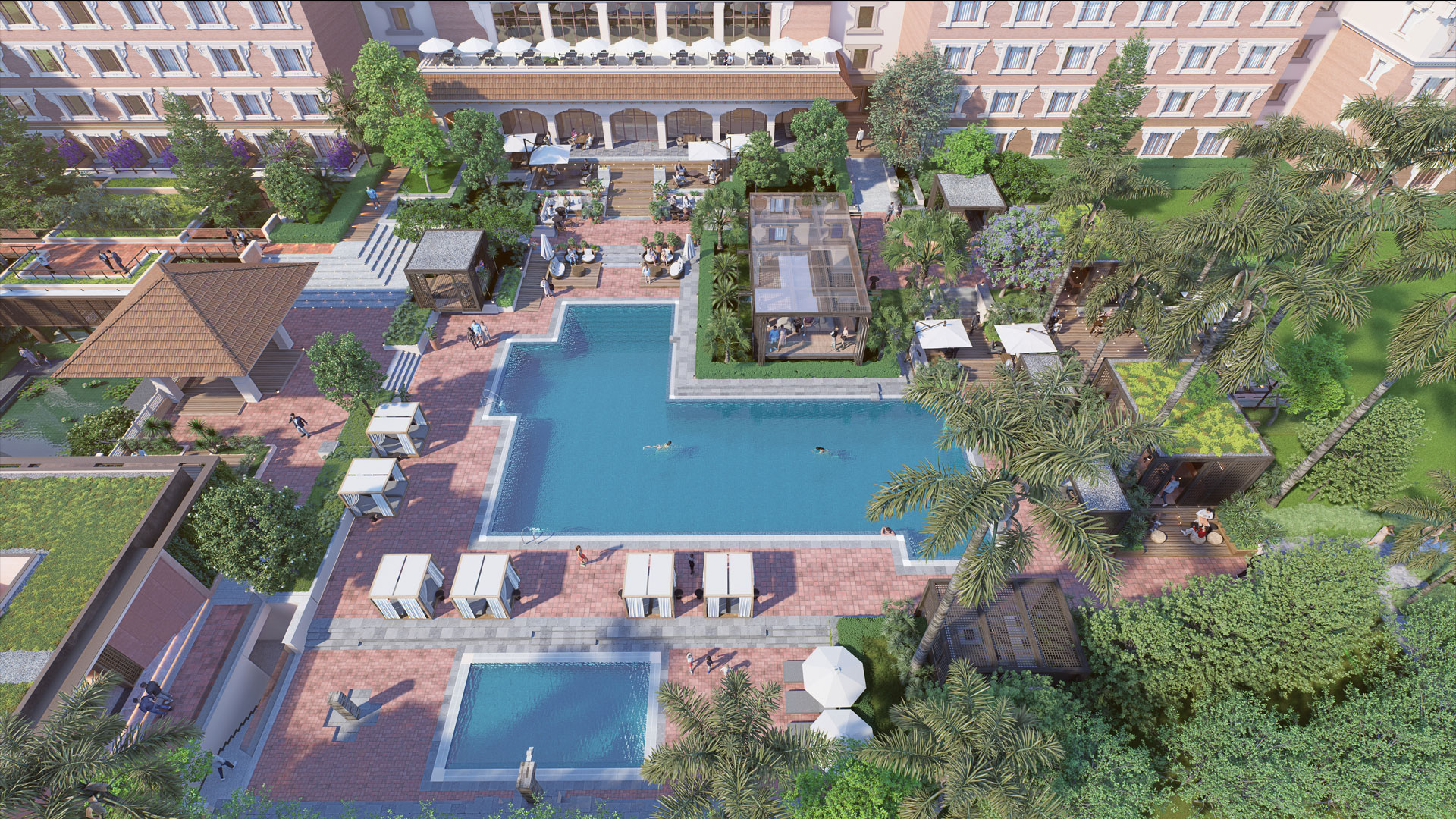 A key feature of the redesign is the creation of a tiered and varied landscape. Pavilion-like structures will be dispersed across the main area, breaking up the large space into a series of smaller, more intimate settings. In addition, a series of terraces are introduced, creating an amphitheater-like arrangement where different activities can be staged. These terraces will provide excellent views of the pool, creating a natural focal point for the space and offering guests a dynamic and engaging environment to relax and socialize.