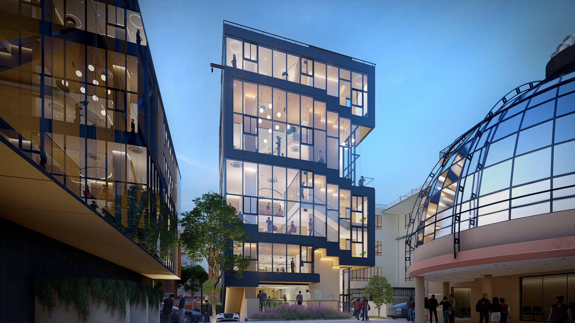 Various programs of this polyclinic are vertically arranged to maximize the development potential of a small site. Each floor has two distinct parts: the front designated for common areas such as lobbies and break rooms, and the back providing private spaces such as clinic and lab spaces. The play of opaque and transparent building façade reflects this duality in the spatial configuration.
