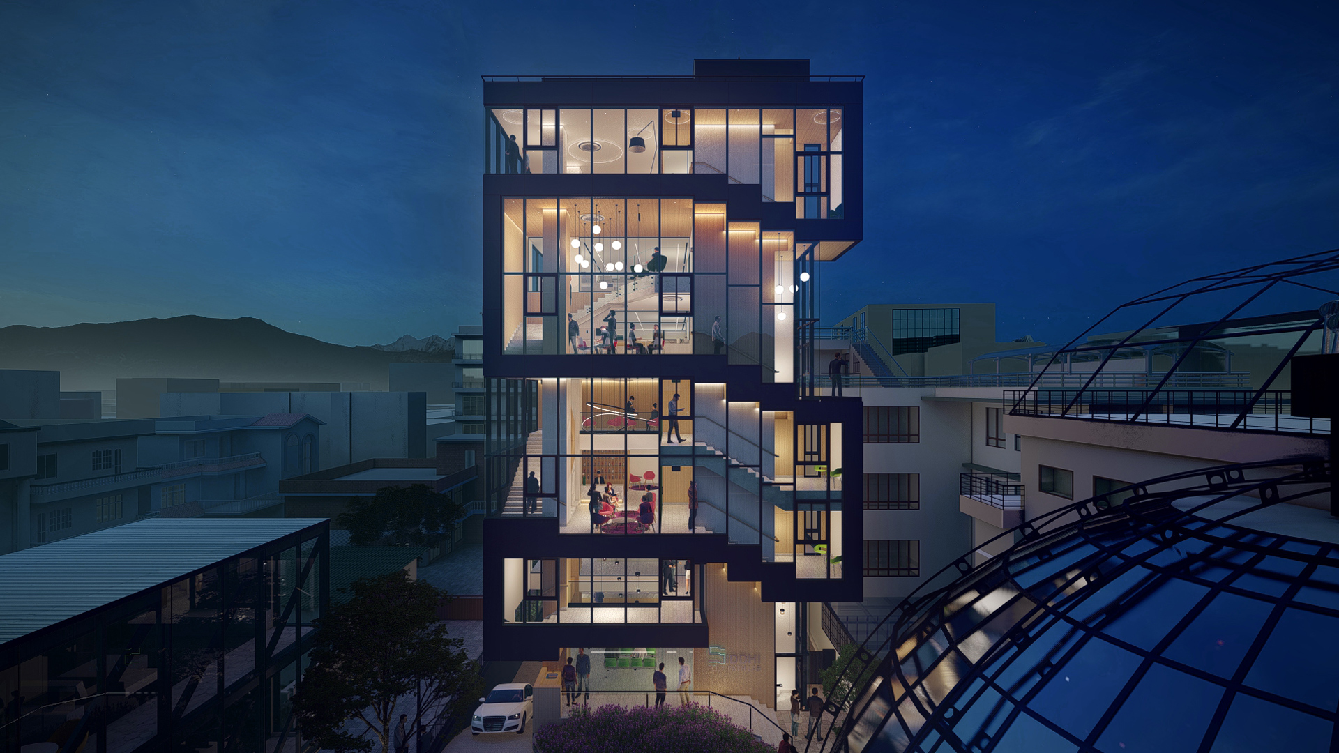 The building has been designed to promote a healthy lifestyle – cross ventilation, natural lighting, and walkable structure. While elevators being an important circulation component, the design of staircases takes precedence. Besides functioning as a natural “treadmill”, the main staircase here transcends into social and celebratory space, providing sense of individuality to various departments while bringing them together as one unit. An assembly of twisting and turning staircases playfully create different quality of spaces interspersed vertically, and when seen together looks like a big, “S” logo written on the façade giving the Polyclinic a distinct identity.