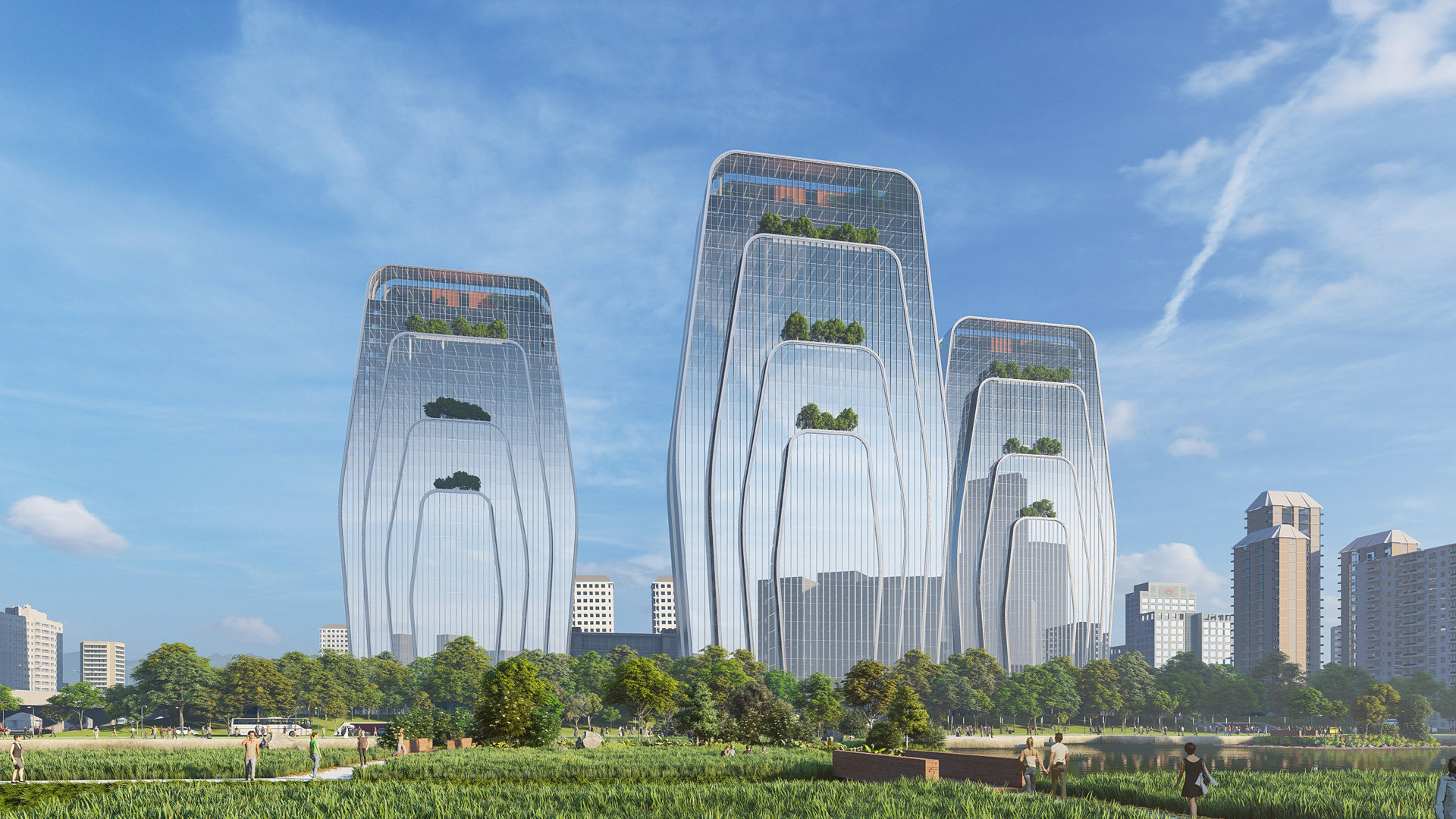 A set of three identical office buildings with a retail podium is set in a dynamic urban setting. The three towers is an important addition to the city skyline and serve as way-finding landmark as it is set within a bigger park and is visible from the distance. The design of 34 story tower is inspired by unique mountainous landscape found in Vietnam where vegetation grows on rocktops and within crevasses. The shape of the tower bulges out in the middle – increasing the floorplates where rents are optimal. The shear walls mostly located on the east and west facades of the building help in the towers structural stability while decreasing the dimensions of internal columns. The shears walls also act as solar barriers, blocking steep summer sunlight from east and west. The top of the tower is crowned with winter garden accessible to public at large. The winter gardens include multiple venues ranging from cafes, recreational spas, to conference spaces.
